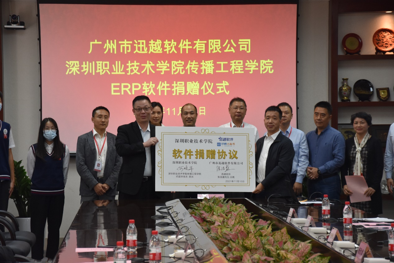 为支持传播学院印刷包装产业智能化信息化人才的培养,广州迅越软件公司决定向传播学院捐赠总价值189.8万的ERP系统和印刷报价软件。捐赠仪式于11月10日在留仙洞校区明德楼109会议室举行。学校党委书记杨欣斌、迅越公司运营总裁张浩盛、董事技术总裁何永志、董事市场总裁吴皓仪、国资处副处长肖钢以及传播学院师生代表共同出席了本次捐赠仪式。捐赠仪式由传播学院总支书记杨燕云主持,院长何颂华与迅越软件公司代表张浩盛总裁签署了捐赠协议。