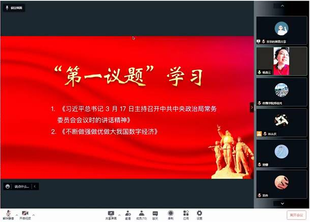 会上,党总支书记杨燕云带领全院老师学习了习近平总书记3月17日主持召开中共中央政治局常务委员会会议时的讲话精神、在《求是》杂志上发表的文章《不断做强做优做大我国数字经济》。杨燕云结合学院实际,对全体老师提出两点要求。在疫情防控上,全体老师要深入贯彻落实党中央方针政策,严格听从深圳市、社区、学校等部门的工作部署,统一思想、坚定信念,细抓落实各项防疫工作;在专业建设上,要深刻认识数字经济与各专业发展的重要意义,她鼓励老师加强关键核心技术攻关能力,持续推动构建专业发展新格局。