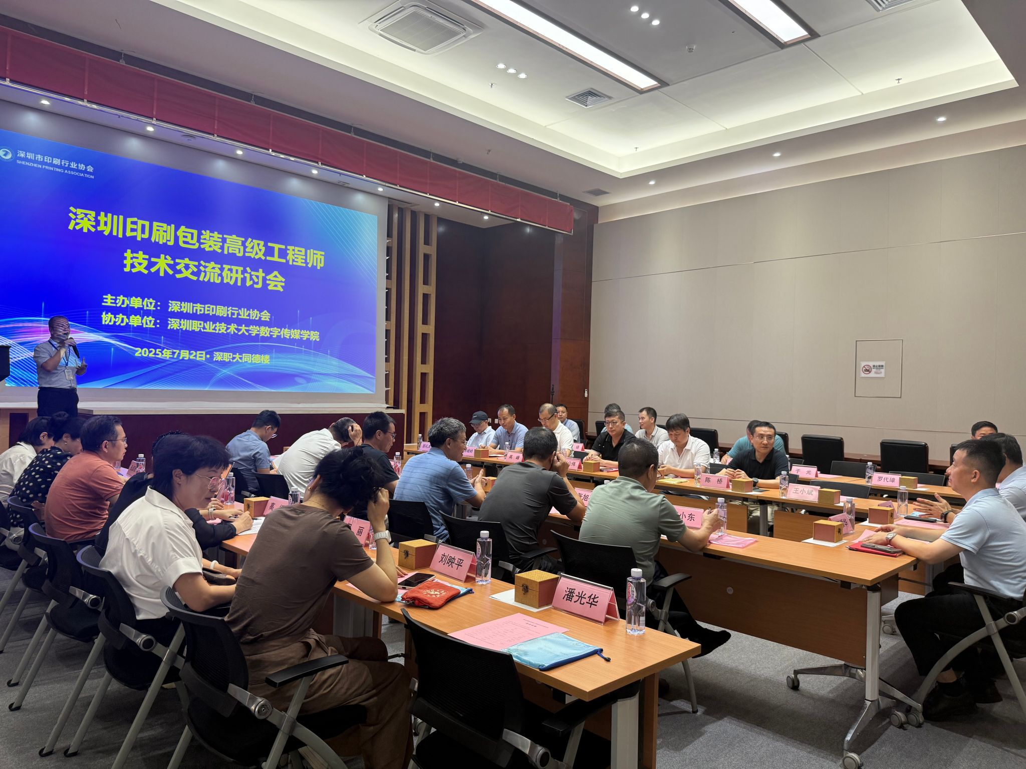 7月2日,由深圳市印刷行业协会主办、数字传媒学院协办的“印刷包装行业高级工程师技术交流研讨会”在同德楼23楼六号会议室召开。会议围绕“技术赋能·职称引领·产学研融合”主题展开,数字传媒学院院长何颂华、行业协会领导、企业技术骨干、高校专家等30余位代表参加会议,共同探讨印刷包装领域技术职称发展路径与产业创新生态构建。