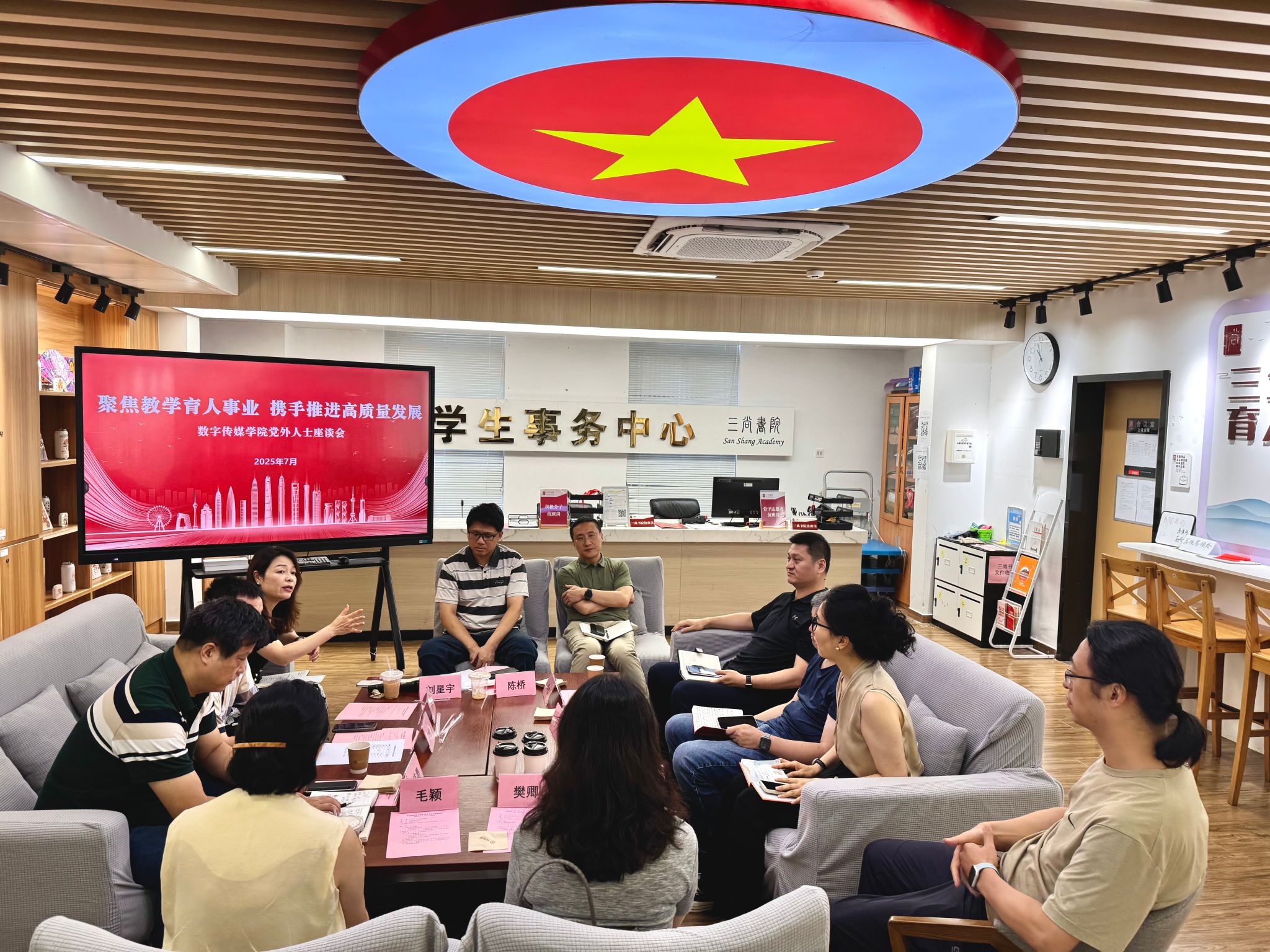 为深入贯彻落实习近平总书记关于做好新时代党的统一战线工作的重要思想,扎实推进中央八项规定“开门教育”要求,广泛听取师生群众意见,7月3日上午,数字传媒学院在三尚书院活动中心召开党外人士座谈会,主题为“聚焦教学育人事业 携手推进高质量发展”。学院领导、党委委员及各民主党派、无党派人士教师齐聚一堂,聚焦教育教学重点工作,共商学院高质量发展大计。