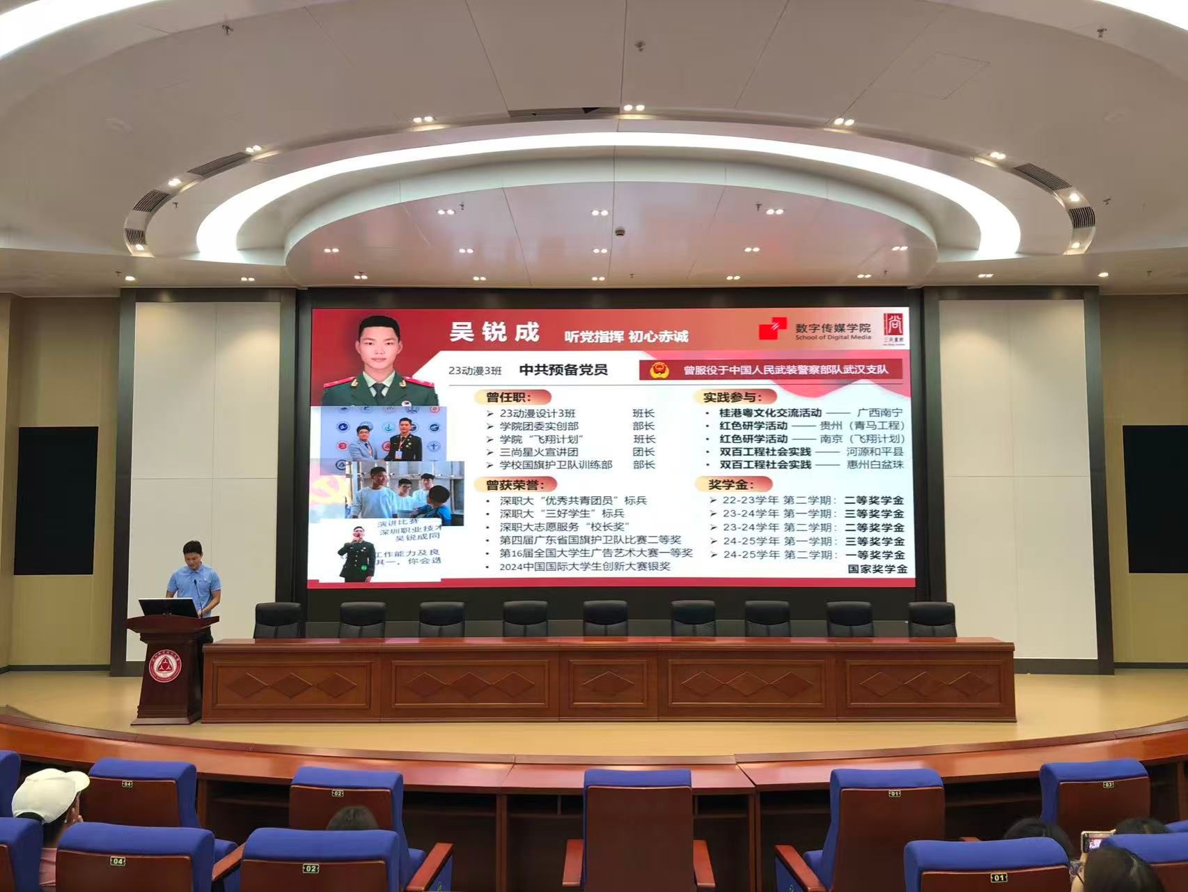 在榜样分享环节,预备党员吕思萤以“红心向党矢志不渝”为主题,结合其担任年级长、社团负责人的经历,分享参与思政研学、社会实践的收获,强调责任与服务意识;吴锐成同学则从部队服役经历出发,讲述如何将“听党指挥”的信念融入学业与竞赛,并屡获国家级奖项的成长历程。二人的事迹生动展现了学生党员在思想引领、学业实践中的示范作用。