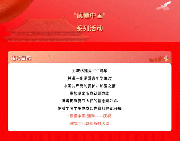 回顾中国共产党百年历程,有波涛汹涌,有辉煌荣光,岁月峥嵘,仍不忘初心。为庆祝中国共产党百年华诞,传播学院学生党支部先锋社面向传播学院全体学生开展了“读懂中国”活动。活动时间为1月29日至3月26日,活动主题为“讲好入党故事,传承红色基因”。
