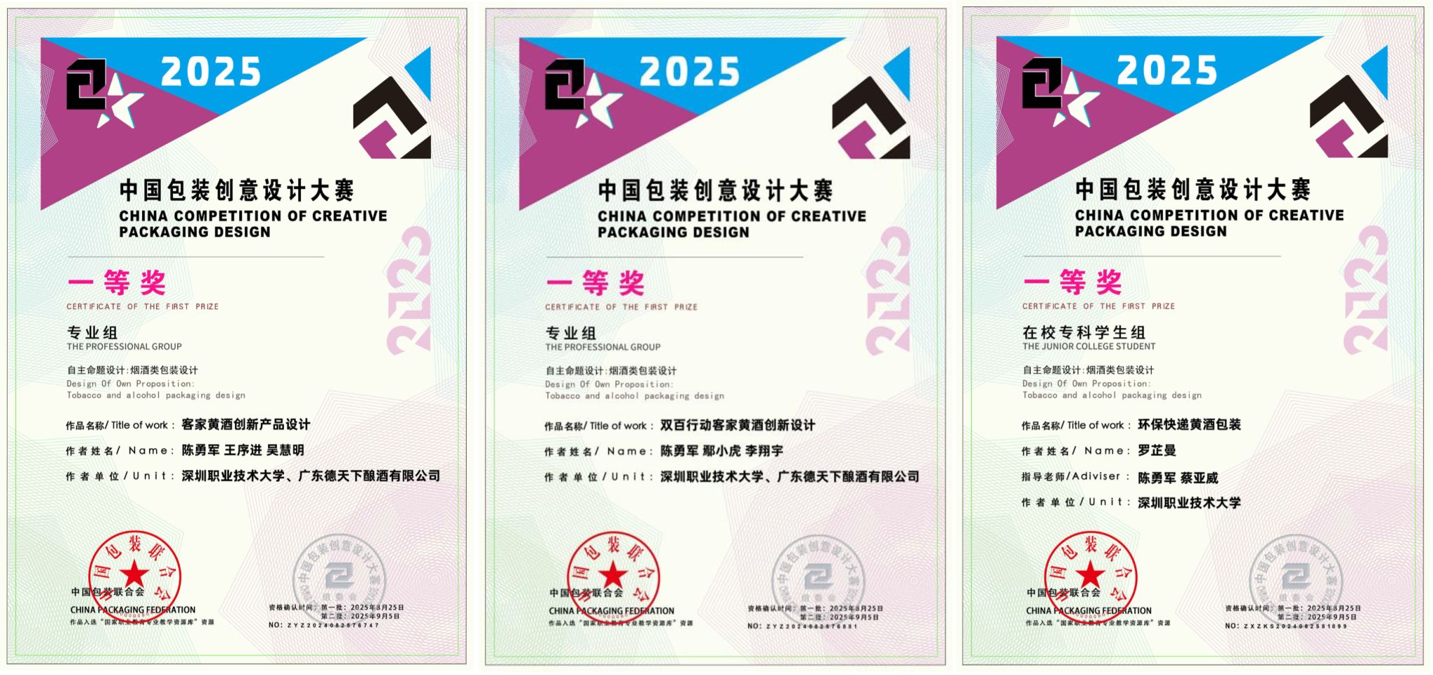 基于本次“双百行动”客家黄酒创新项目,师生创新团队,践行包装设计专业以科研成果落地服务产业的理念为目标,将实实在在的企业实际需求融入科研与教学工作,并取得良好的的效果,设计成果不但获得企业高度认可,并获得全国权威设计大奖2025年中国包装创意设计大赛专业组1等奖2项,学生组一等奖1项、二等奖2项、三等奖3项(本届大赛获奖比例为:一等奖1.07%,二等奖2.36%,三等奖9.23%,优秀奖15.02%)。下一阶段,项目组将依托调研成果,持续优化“一品多装”产品矩阵及“包装即媒介”传播体系,力争年内完成专利布局、落地校企联名产品,并推动和平县黄酒产业链销售额持续增长,为乡村振兴注入可持续的“设计动能”。