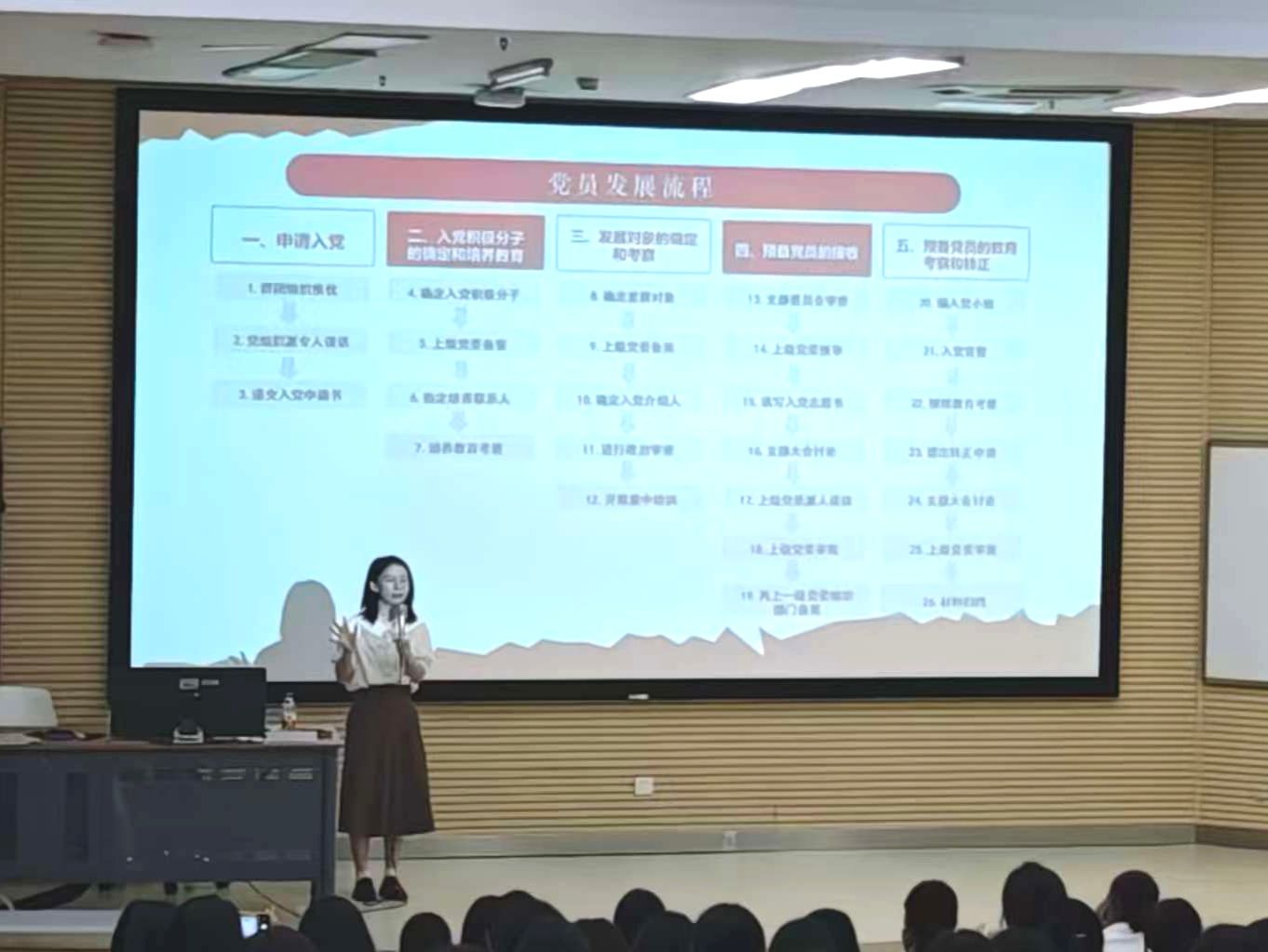 学院充分发挥学生党员“身边榜样”的示范引领作用,组织学生党员深入各新生班级,开展“我的入党故事”主题分享会。党员们结合自身经历,真挚讲述从提交入党申请书到接受组织培养考察、最终光荣入党的心路历程,分享在思想淬炼、专业学习、社会实践、服务同学等方面的成长感悟。这些真实、生动的“朋辈课堂”,拉近了党组织与新生的距离,使抽象的理想信念变得具体可感,有效激发了新生向党组织靠拢的意愿和行动自觉,现场互动积极,反响热烈。