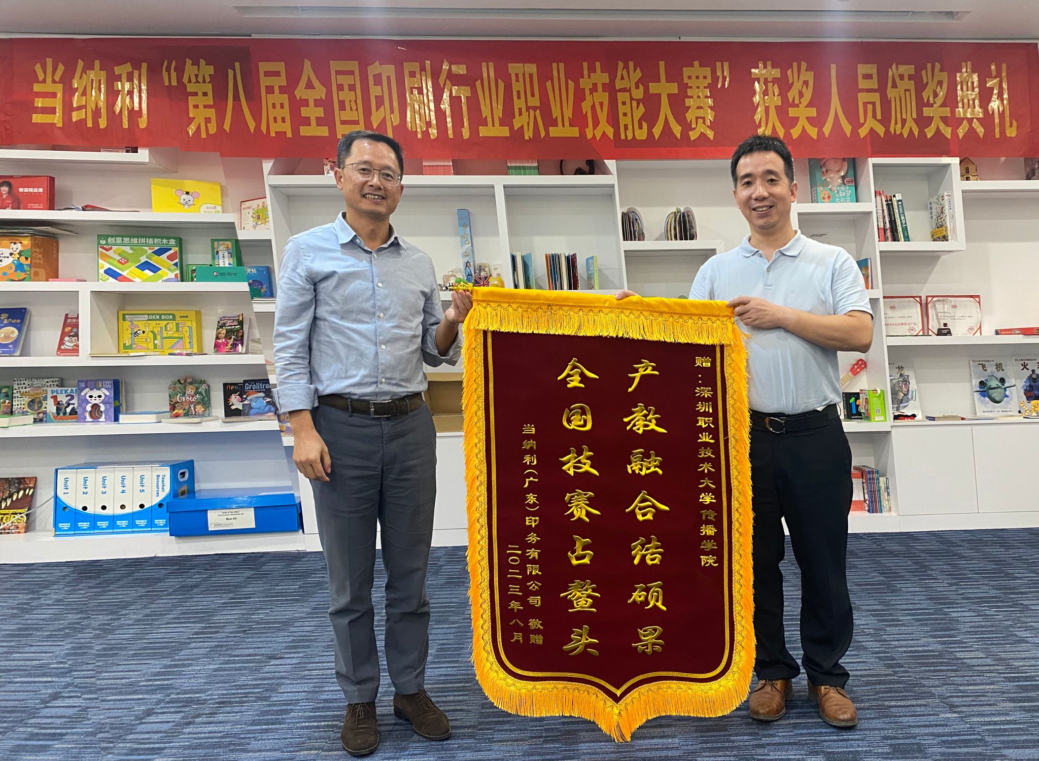 近日第八届全国印刷行业职业技能大赛全国总决赛成绩公布,8月29日,当纳利公司领导和参赛选手满怀感激之情,将绣有“全国技赛占鳌头 产教融合结硕果”的大红锦旗送到传播学院院长何颂华手中,表达了对学校老师自备赛以来对参赛选手悉心指导、认真培养的感激之情,感谢指导教师的辛勤付出。