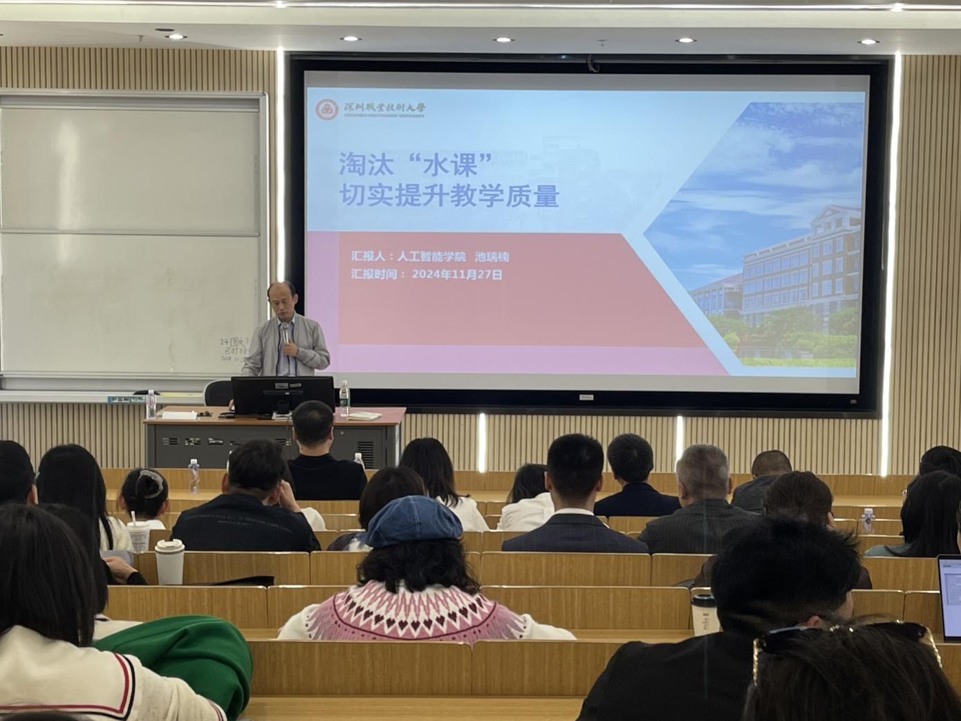 活动上,池瑞楠讲述了为何关注“水课”、何为“水课”以及如何淘汰“水课”。淘汰“水课”,源头在“师”,核心是“课”,重在“过程”。教学质量的核心在于课程质量,而淘汰“水课”则是提升高校竞争力的关键。教学工作是学校人才培养的核心工作,教学是每一位老师的安身立命之本,不能因人设课,需根据人才培养目标,而不是根据教师个人的兴趣或研究方向设置课程。随后,池瑞楠还针对我院的金课及其他教研建设提出了许多宝贵的建议。