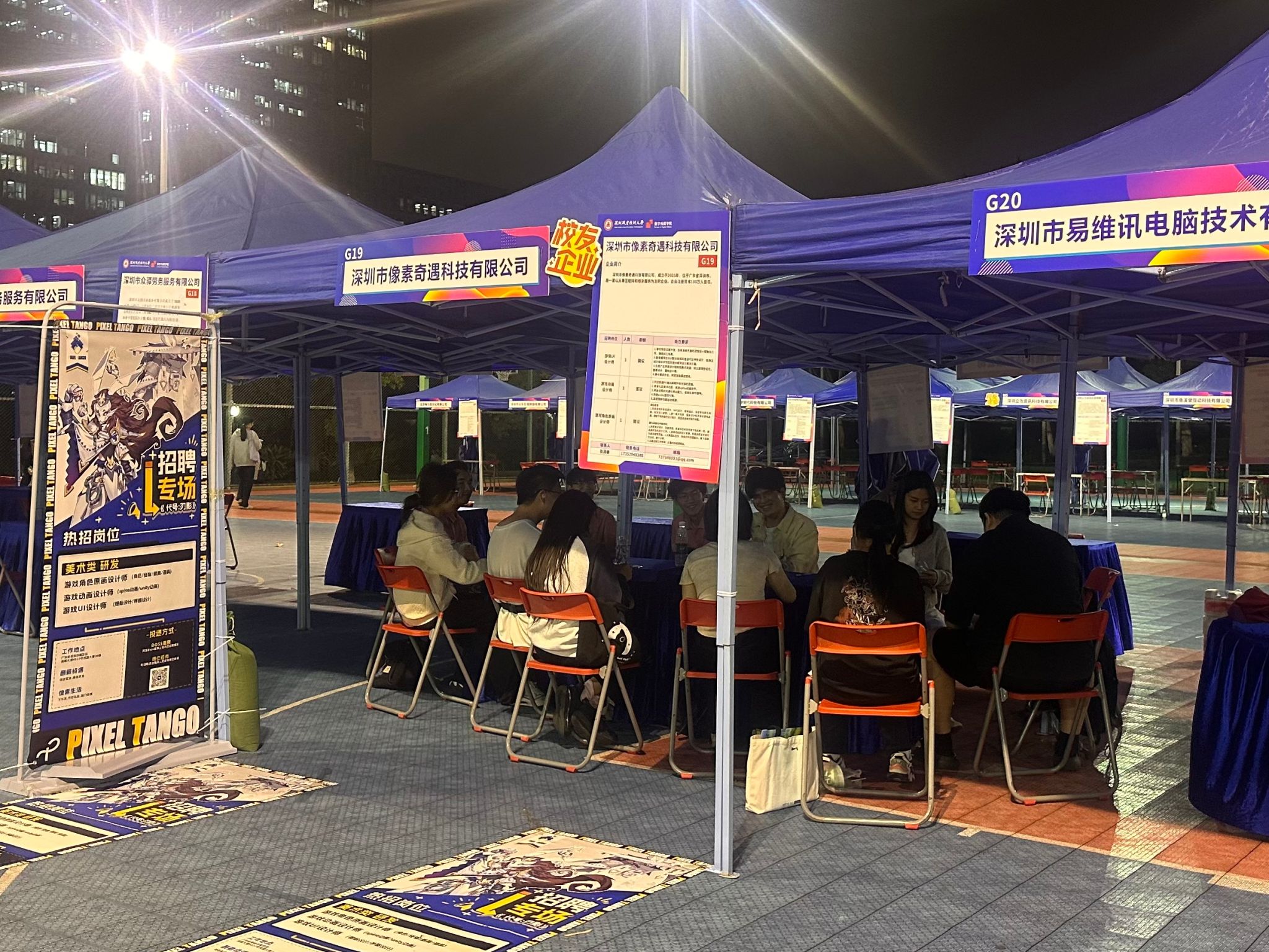 本次招聘会特别设置了校友企业专区,共有36家由校友创办或担任高管的企业参与,成为现场一大亮点。招聘会结束之际,校友企业深圳市像素奇遇科技有限公司展位依然氛围热烈,企业代表与23级、24级学生围坐一堂,耐心解答行业疑问、分享职场经验,将招聘现场延伸为生动的职业发展课堂。这种“传帮带”式的交流,不仅为低年级学生提供了前瞻性的职业规划指导,也体现了校友情系母校、反哺育人的深厚情谊,彰显了学院“校友赋能”就业服务体系的温度与效能。