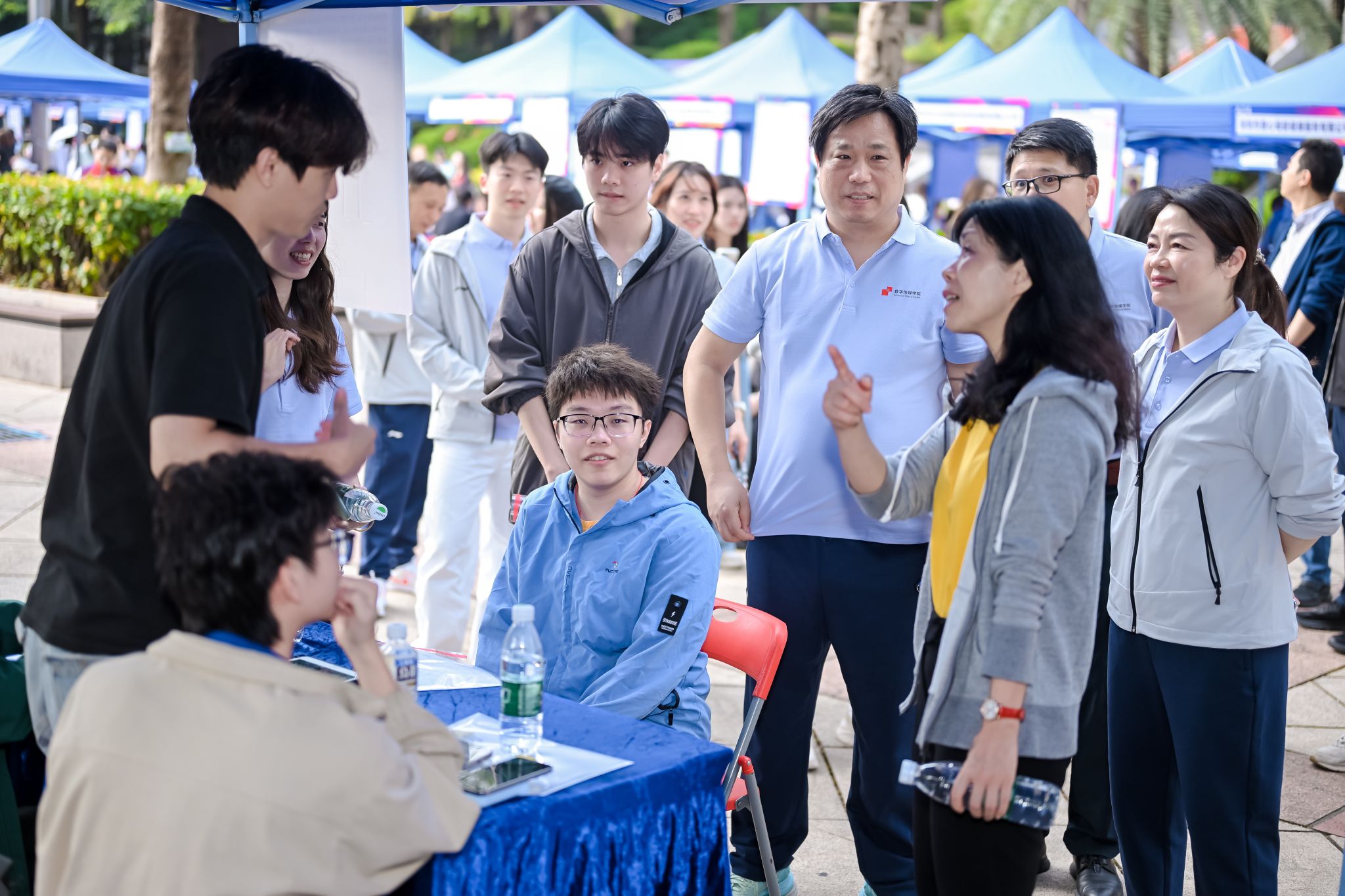 招聘会现场,何莉与黄川川逐一走访企业展位,与招聘负责人亲切交流。在广东博华超高清创新中心有限公司展位前,何莉认真听取企业对我院学生专业能力与综合素质的高度评价,并寄语企业:“期待未来有更多优秀学子加入贵司,并代表公司回到母校招聘,形成人才培养与输送的良性循环。”在校友企业深圳市云荣智创科技有限公司展位,何莉与创业校友深入交谈,鼓励其坚持创新驱动,不断发展壮大,并积极返聘母校优秀人才,反哺学院人才培养。