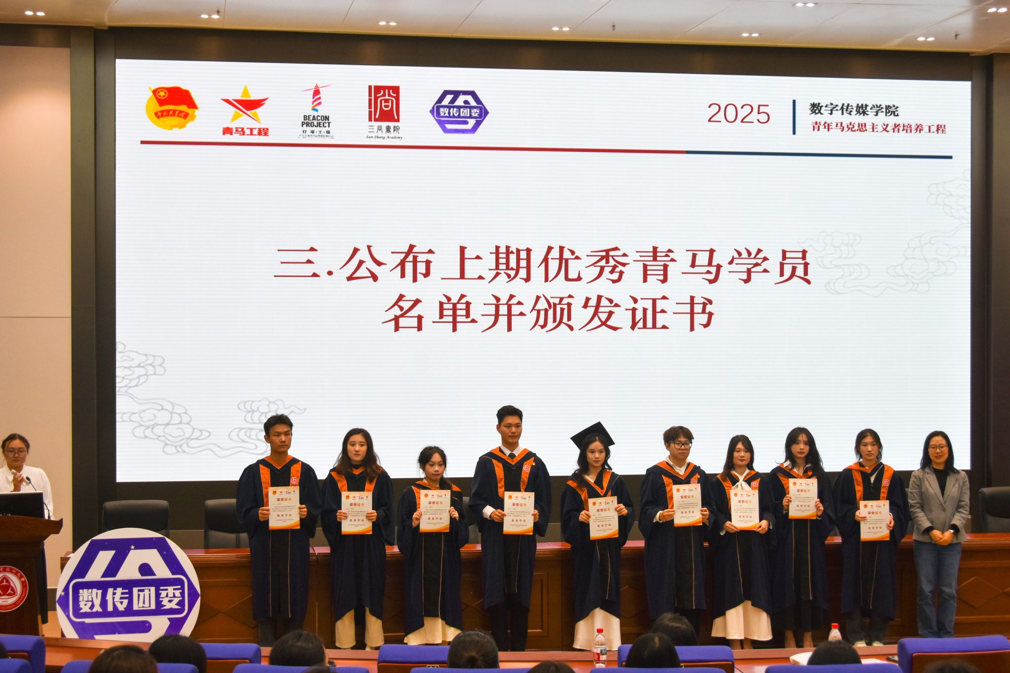 2025年11月19日下午,深圳职业技术大学数字传媒学院在留仙洞校区图书馆报告厅举行2025-2026学年青年马克思主义者培养工程开班仪式暨第一课。马克思主义学院张莎莎老师、学院团委书记任源梅、团委指导老师曾嘉欣、学生干部代表以及新老两期青马工程学员共同参加了本次活动。