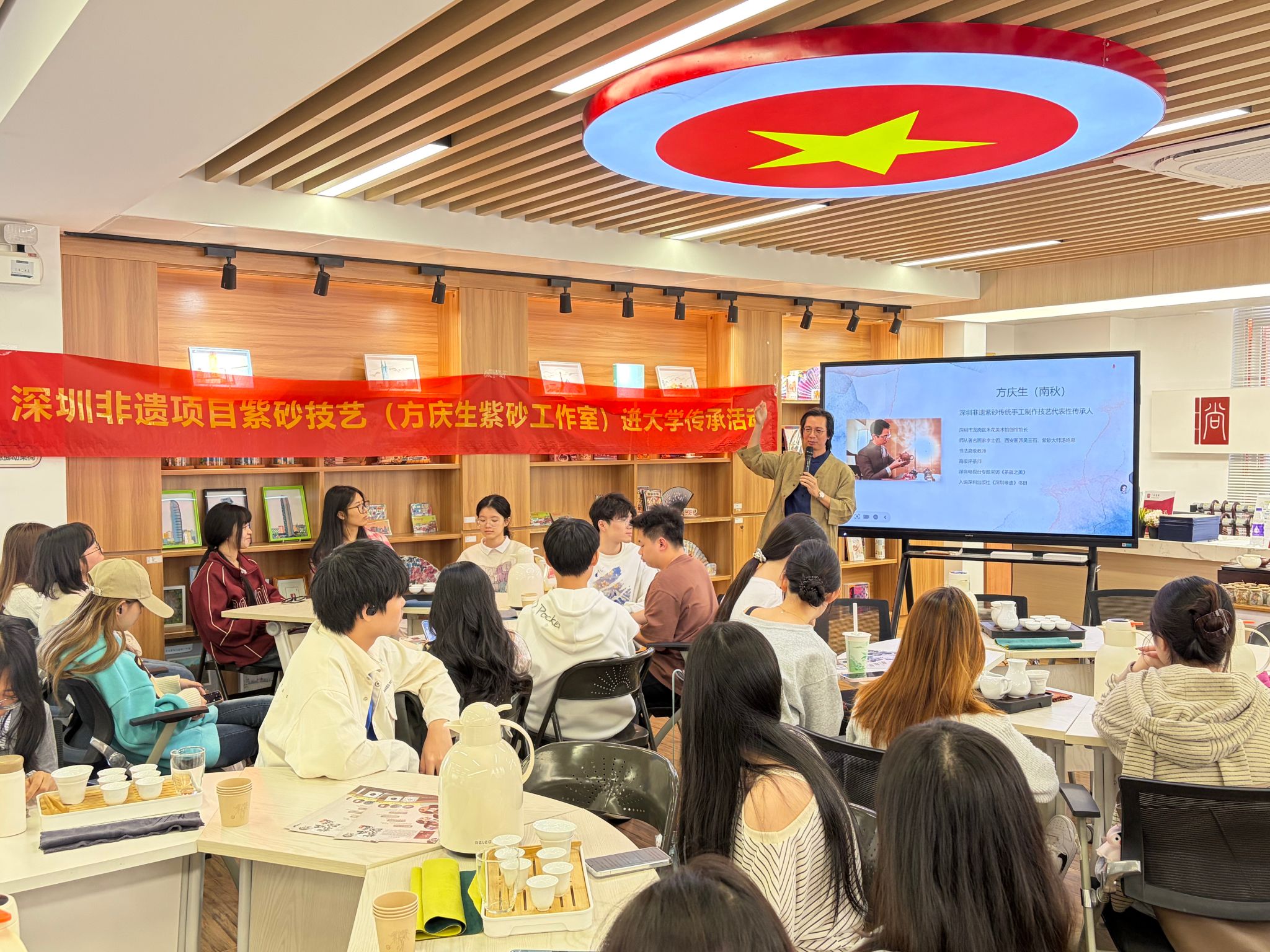 方庆生作为紫砂壶手工制作第四代传承人、高级评茶师,深耕紫砂艺术多年,曾接受深圳电视台《茶器之美》专题采访,作品入编《深圳非遗》书目并参与意大利国际艺术展,多件代表作被高校收藏。他以“紫砂壶的泥料、器型与茶类的科学适配”为主题,从紫砂的“双气孔结构”讲起,系统解析了不同泥料与器型对茶汤风味的影响,并现场演示如何根据茶类选择适配的紫砂壶,引导学生理解“器为茶生”的文化内涵与科学逻辑。
